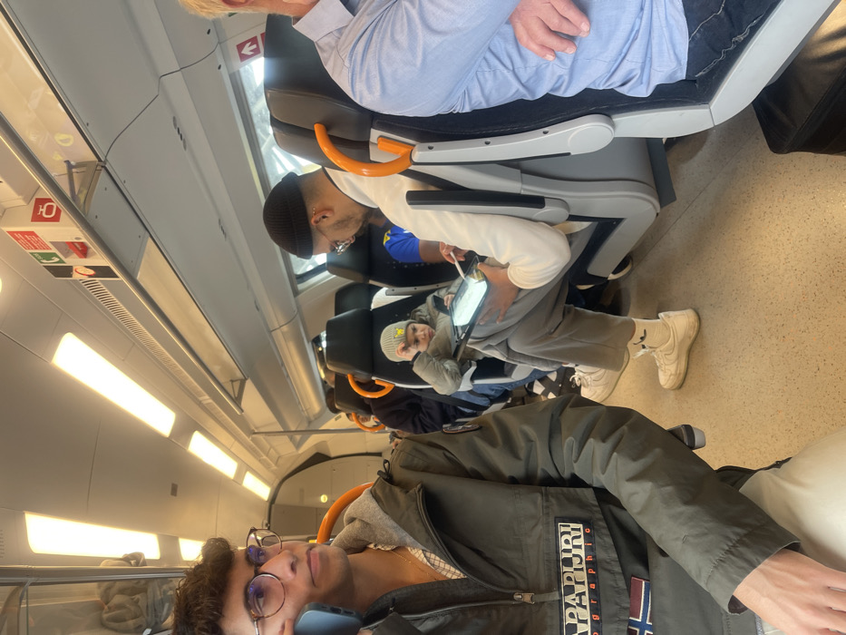 The image displays the interior of a passenger train carriage, situated in the city of Dusseldorf, Germany