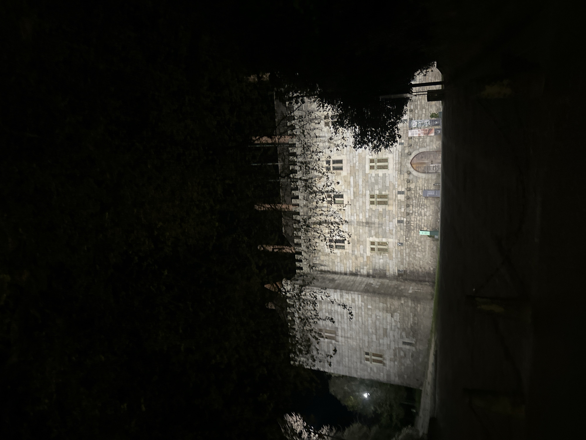 The image displays the Paço dos Duques de Bragança (Palace of the Dukes of Bragança) at night, situated in Guimarães, Portugal. The large, fortified stone building is illuminated, showcasing its light-colored block masonry, crenellated roofline, and multiple rectangular windows, which emit a warm, yellowish light. A prominent square tower is visible on the left facade. The main entrance, a large arched wooden door, is centrally located on the visible front facade. Several tall, dark chimneys extend from the roof. The scene is viewed from a slightly lower elevation, looking up a dark, paved path or road that curves towards the palace. Two light-colored bollards connected by a chain are positioned on the left side of this path. Dark, silhouetted tree branches with sparse foliage overhang the top and sides of the frame, partially obscuring the upper sections of the palace and the dark night sky. Several vertical banners or signs are visible near the palace's entrance. No individuals or active subjects are present. The environment is dark, quiet, and appears still.