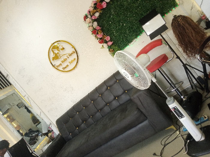 The image depicts the interior of the "Henry Miller & Family Unisex Saloon" located in Sabon Tasha, Nigeria. The scene is an indoor commercial space with white, textured walls and a light-colored tiled floor. A gold-colored, oval acrylic sign displaying a stylized silhouette of a person's head with hair, scissors, and the text "Henry Miller & Family Unisex Saloon" is affixed to the upper-left wall. To its right, a wall decoration features an L-shaped arrangement of artificial green turf adorned with pink and red artificial flowers. In the center-left, a dark grey or black tufted sofa with gold-colored buttons is positioned. To the right of the sofa, a white pedestal fan is operating, indicated by a green light on its grille. Behind the fan, a red-seated bar-height stool with a chrome base is visible. Further to the right and slightly behind, a brown, curly wig is displayed on a black tripod stand. Adjacent to the wig, a black-framed square LED panel or softbox on a stand is present. A red and white beverage can is partially visible on a surface in the upper-right background. In the lower-left foreground, a seated individual is partially visible, facing away from the camera, with only the top of their head and a shoulder discernible. They are positioned in front of a large, rectangular wall-mounted mirror with a white and gold trim, which reflects portions of the room. Black and white electrical cables are spread across the floor, along with a blue multi-socket power strip.