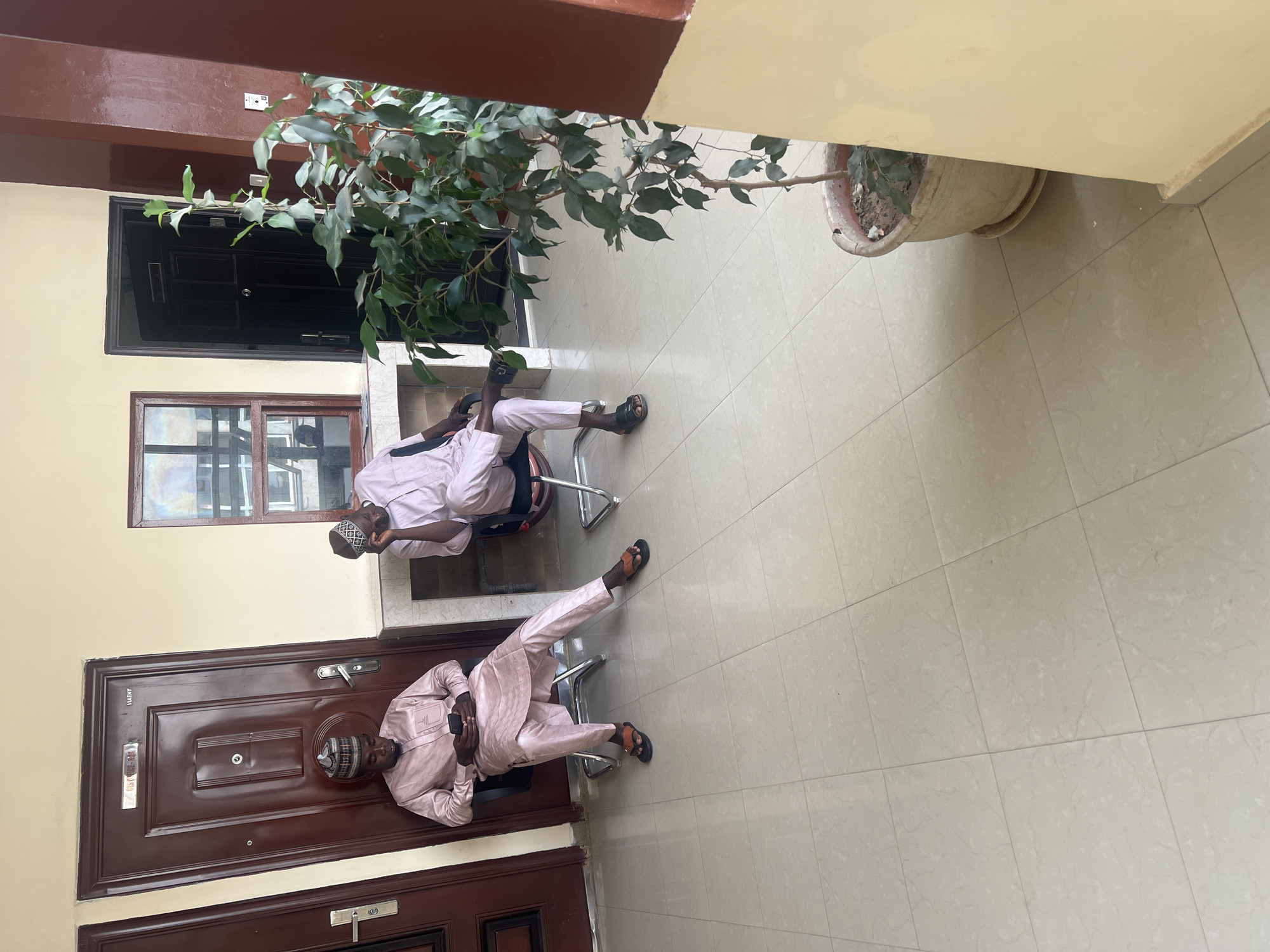 Two men dressed in similar light pink traditional attire are seated on metal chairs in an outdoor courtyard in Jama A, Nigeria. Both men wear traditional caps and sandals. One man is holding a cell phone. The courtyard has beige tiled flooring and walls. A potted ficus tree stands to the side. A dark brown door is visible on one wall, and a black door and a window are seen above it.
