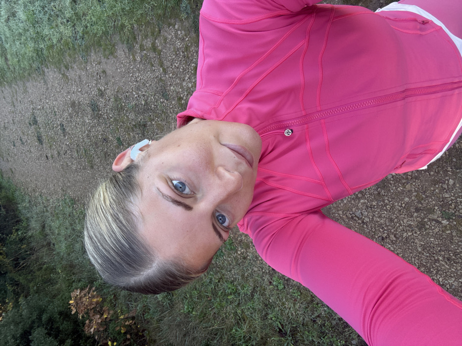 A female individual is depicted in a close-up, high-angle selfie photograph, centered on a dirt and gravel path within a natural outdoor setting in Rousset, France. The subject, a woman with blue eyes and blonde hair pulled back, looks directly at the camera. She wears a bright pink, long-sleeved athletic top with a full-length zipper featuring a Lululemon logo on the pull, over a white undergarment. A light blue wireless earbud is visible in her right ear. The background consists of a narrow, light brown gravel path receding into the distance, flanked by green and partially brown foliage on the left side, indicative of a trail or wooded area.