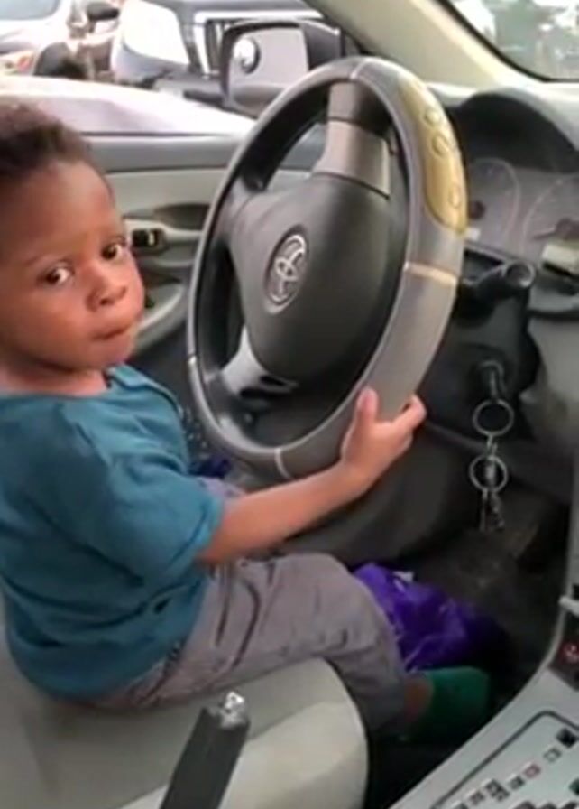 A young child is sitting in the driver's seat of a parked car. The child is wearing a blue shirt, gray pants, and green shoes. The child is reaching for the ignition with their right hand to turn the car on. The car is a Toyota Corolla, and other vehicles are visible in the background. The steering wheel has a silver and gold cover.