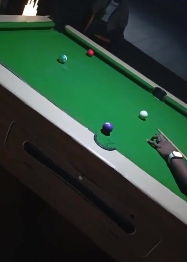 A person is lining up a shot in a pool game. The pool table is green with white rails. There are four balls on the table: one white, one green, one red, and one purple. The purple ball sits on a black spot. A cue stick is being used. Another person is sitting in the background watching. The surrounding environment is dimly lit, possibly a bar, as a neon sign is visible in the background.