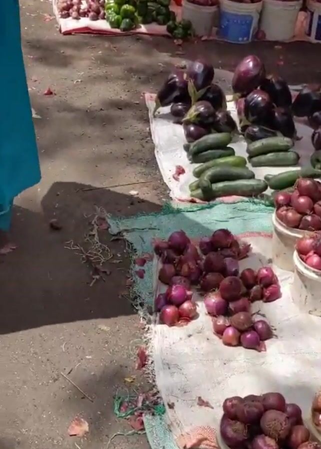 The video depicts an outdoor market scene, where various vegetables and produce are displayed for sale