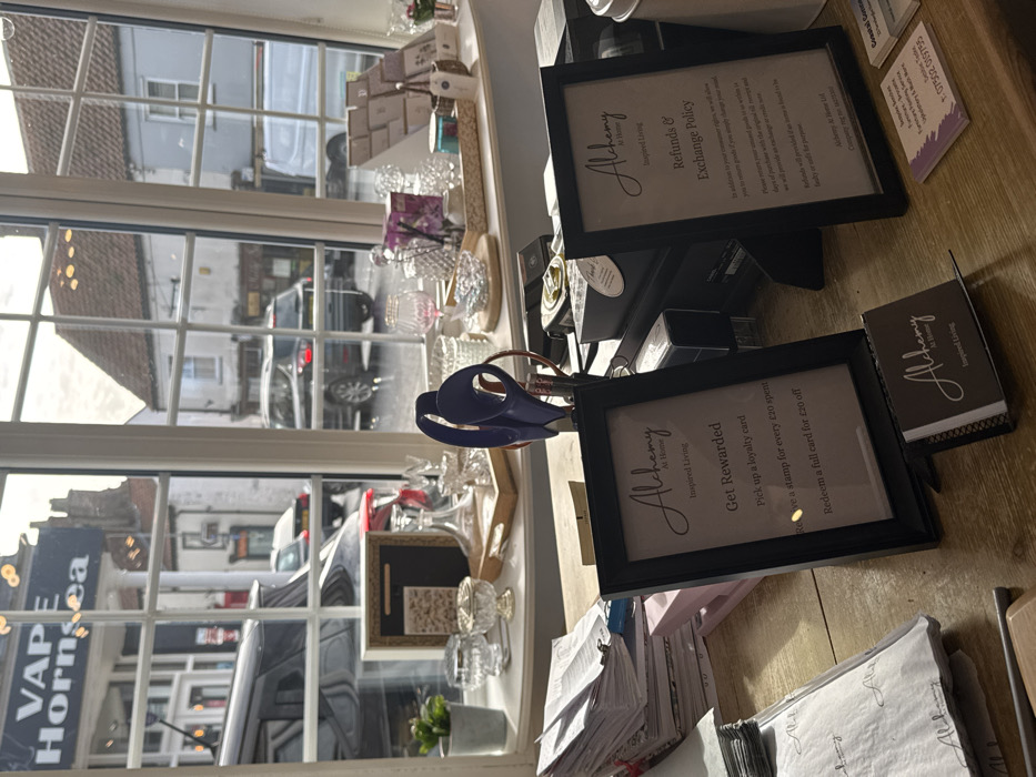 The image presents an interior view from a shop named "Alchemy At Home Inspired Living," located in Hornsea, United Kingdom, looking out onto a street scene
