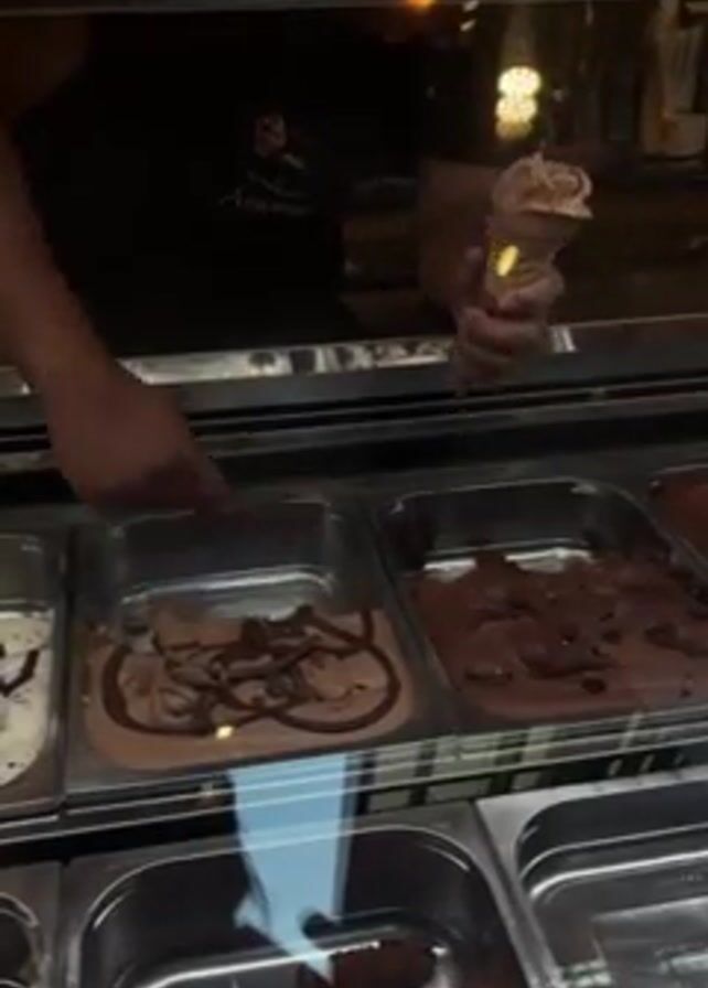 A person is making an ice cream cone. The person is standing behind a glass display case containing various flavors of ice cream. The person is scooping brown ice cream with a silver scoop and placing it on top of a sugar cone. The ice cream flavor appears to be chocolate hazelnut. The person is wearing a black shirt.
