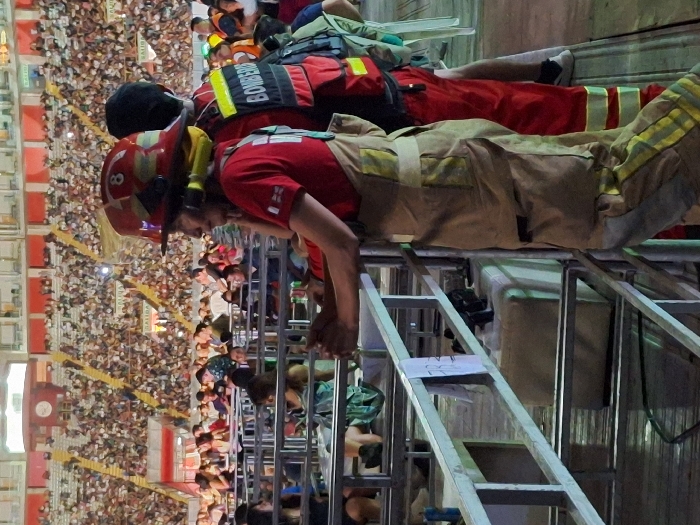 Two firefighters, a man and a woman, stand in front of a metal barrier in the Estadio Nacional in Lima, Peru, specifically at the location with coordinates -12