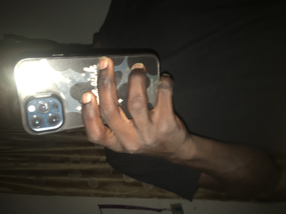 A dark-skinned hand holds an iPhone in a patterned case. The phone's camera lens array is visible. The setting is dimly lit, with a bed or cushion in the background. The arm is partially visible, extending from the hand, and a piece of clothing is also present. The image's overall quality is somewhat grainy.
