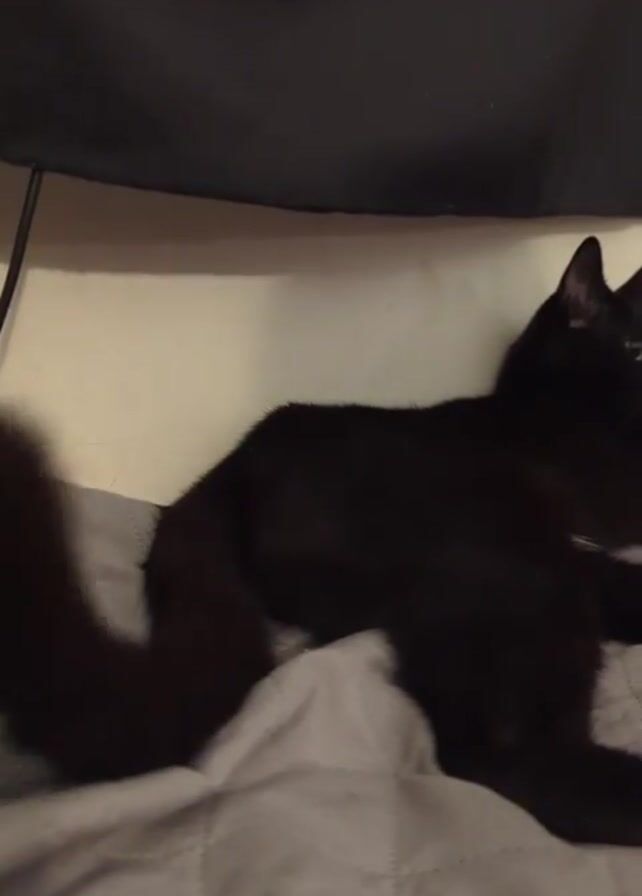 - "black cat lying on a grey quilted surface, possibly a bed, positioned against a light-colored wall" by FM-vrtZw1, licensed under CC BY 4.0
