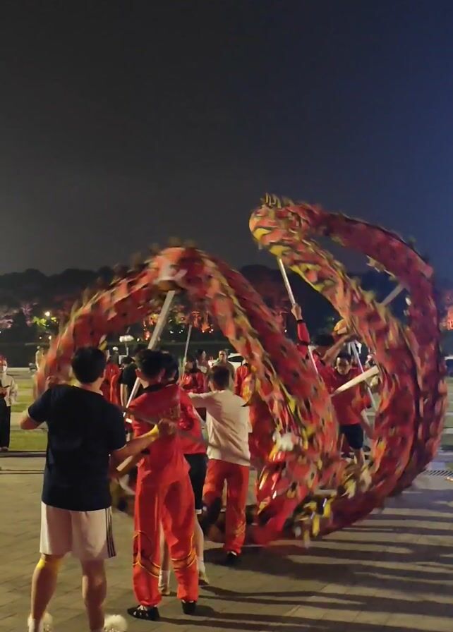 At night, a group of people in red outfits performs a dragon dance on a paved area. The dragon is red and yellow, and several people hold it up with poles. Other people stand around watching. There are trees and lights in the background.