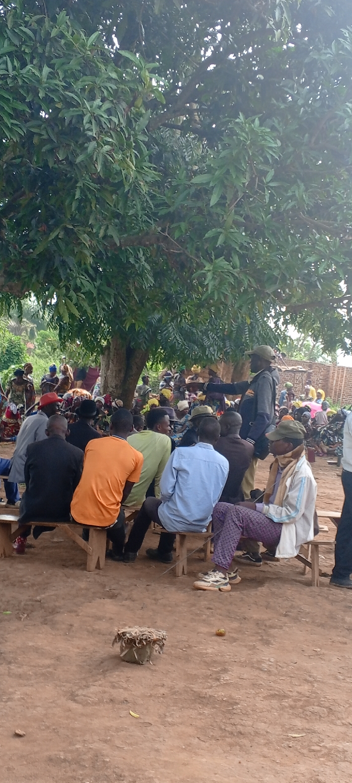 A group of people is gathered outdoors, seated on benches under a large tree with dense foliage. Most individuals are facing away from the camera. One man stands, pointing towards the larger gathering behind the seated group. In the foreground, a small, round object covered in straw sits on the ground. The ground is reddish-brown. Most of the people wear colorful clothes and hats.