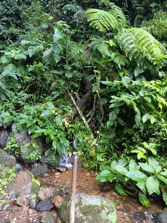 A lush, green forest scene features dense foliage, ferns, and small trees. A stream flows over rocks and undergrowth, with a metal pipe standing in the water. The vegetation is vibrant and healthy, creating a tranquil, natural setting. The scene suggests a humid environment with abundant plant life.