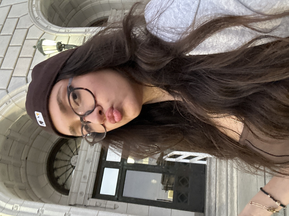 - "A young female is depicted in a selfie, posing with pursed lips, wearing a dark brown beanie with a white MLB logo and round tortoiseshell-patterned glasses" by FM-lh4BM2, licensed under CC BY 4.0