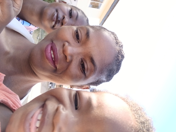 A close-up, selfie-style photograph depicts three individuals outdoors in Jos, Nigeria, under bright, clear daylight. The central figure is an adult female with dark skin, dark braided hair, and magenta lipstick, looking slightly downward and exhibiting a subtle smile. To her right, in the extreme foreground, a young child with dark skin and dark curly hair smiles broadly towards the camera, displaying teeth, and wears an orange-toned top. Partially obscured behind and to the left of the central adult, a younger female, possibly a teenager, with dark skin and dark hair, smiles towards the camera with glossy lips, wearing a light-colored, patterned garment. The background, mostly out of focus, reveals a segment of a light-colored building with dark-framed windows on the left, and indistinct outdoor elements under a vivid blue sky.