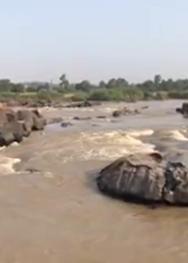 wide river with muddy water flowing rapidly around large, dark rocks. The riverbanks are lined with green vegetation and trees in the distance. The sky is a light blue color. The overall scene suggests a natural environment with a flowing river and surrounding greenery.