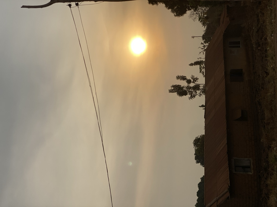 An earthy-toned landscape features a hazy sky with the sun shining through. To the right, a building with a rusty red roof is partially visible, windows punctuating its walls. Trees grow near the building and behind it. Power lines stretch across the top left of the frame, connected to a branch. The overall scene conveys a rural or natural setting, potentially shrouded in mist or smoke.