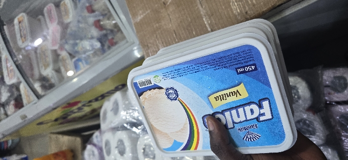 The image depicts a close-up, slightly angled view of a retail environment in Uyo, Nigeria. A dark-skinned left hand is holding a stack of "Fan Vanilla" ice cream containers, with the top container clearly visible, displaying its blue and white label, "FanMilk" branding, "Vanilla" flavor, and 450 ml volume. In the upper right background, a commercial freezer with a curved glass top is visible, containing various packaged frozen food items and bottles. In the lower-left background, several rolls of individually plastic-wrapped toilet paper are stacked. The scene captures an individual handling merchandise within a store setting.