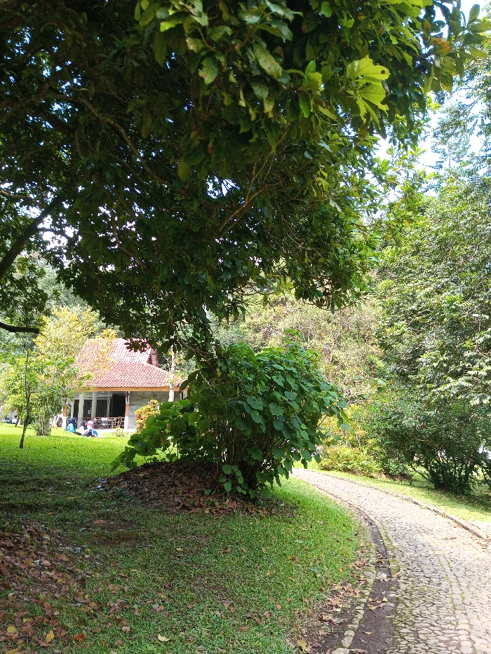 The image displays an outdoor scene in Serchhip, India, featuring lush green vegetation and a clear sky under visible sunlight. In the foreground, a large tree with dense green foliage occupies the upper left quadrant, partially obscuring the sky. The ground is covered with green grass, interspersed with numerous scattered brown fallen leaves. A winding path, constructed from cobblestones or pavers, begins in the lower right and curves into the midground. Adjacent to this path, a substantial green bush with broad leaves is situated, with a mound of dried brown leaves accumulated at its base. In the midground, positioned to the left of the frame, is a single-story building characterized by a red-tiled gabled roof and light-colored walls. The building exhibits multiple window openings. Approximately five individuals are visible near this structure, appearing to be seated or reclining on the grassy area directly in front of or beside the building. Their specific actions or interactions are not discernible from the provided imagery. The background consists of a dense, forested expanse of various trees and foliage, indicative of a heavily vegetated landscape.