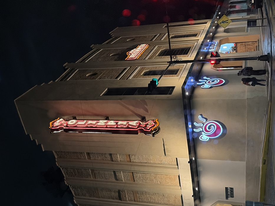 The Olympia Theater's exterior at night showcases its illuminated signs