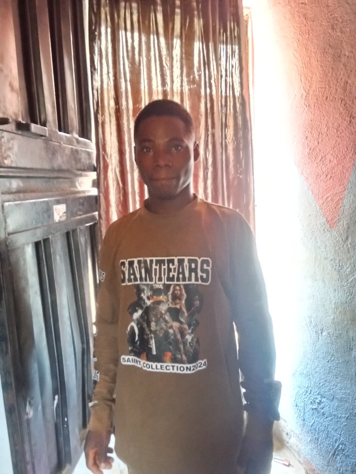 Within an indoor setting in Akwanga, Nigeria, an adult male stands centered, facing the camera directly with a neutral expression