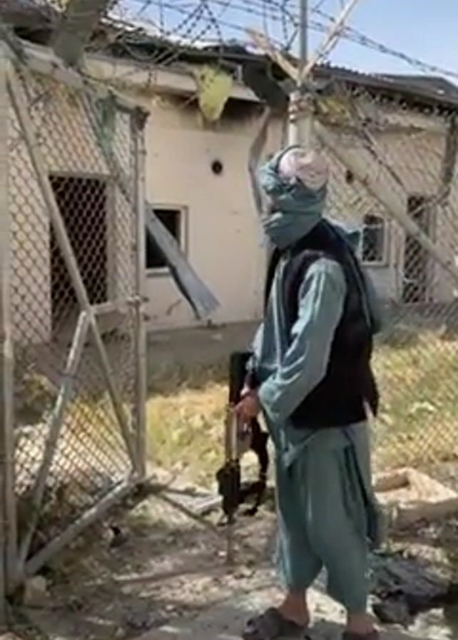 man standing outside a damaged building. He wears traditional garb of light blue, a black vest, a turban, and sandals. He also carries a rifle. He is standing near a chain link fence topped with barbed wire. The building behind the fence appears damaged, with holes in the wall and roof. The man gestures with his hand as if he is talking. The ground around him is gravel. The sky is clear and blue.