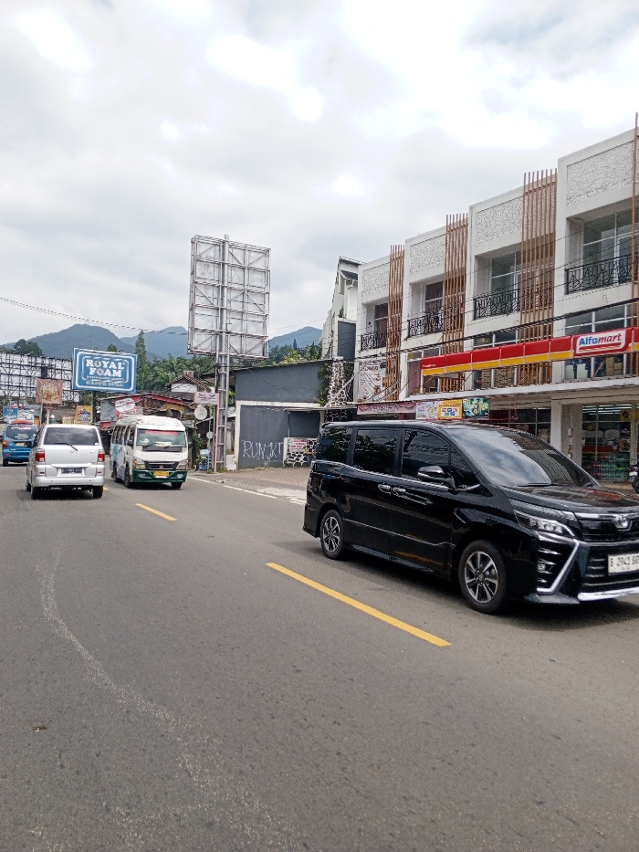 The image depicts a street scene in Cisarua, Indonesia, under an overcast sky