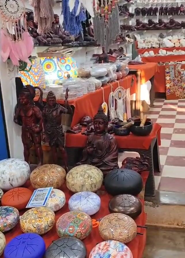 interior of a souvenir shop filled with a wide array of items. The foreground features a display table covered with red cloth, showcasing tongue drums in various colors and designs. Behind the drums are small statues of religious figures like Buddha and Hindu deities. The shop has checkered tile flooring and is filled with display tables covered with red cloth. These tables hold a variety of items including sculptures, dream catchers, and other decorative objects. Shelves lining the walls display small figurines and other collectibles. The lighting is bright and the shop appears well-stocked. The camera slowly pans across the scene, offering a full view of the shop's interior.