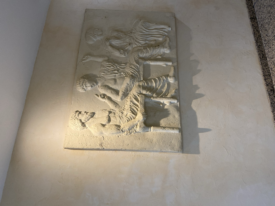 A light-colored rectangular bas-relief sculpture depicting three seated figures is mounted on a textured, light beige wall
