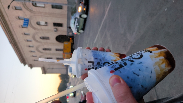 The image displays an urban street scene at dusk in Yerevan, Armenia, located in front of the Ministry of Finance building (Government House 3) on Melik-Adamyan Street. In the foreground, two clear plastic cups, each with a white lid and a white straw, are held by two fair-skinned human hands. The beverages within the cups are layered, exhibiting a dark brown sediment at the bottom, a white creamy layer, and a light blue liquid with white particulate matter. Black lettering, including "PARTNER OF", is visible on the cups. The midground features a paved asphalt road with vehicle traffic. A dark gray sedan with illuminated headlights is visible on the right side of the road, and a yellow truck or bus is further down the street to the left. The background is dominated by a large, beige, multi-story stone building with a classical facade, characterized by a series of prominent arched windows and a large arched entry at ground level. The sky shows the warm orange and yellow tones of twilight, transitioning to a lighter blue overhead. A street light pole is visible on the right margin of the frame.