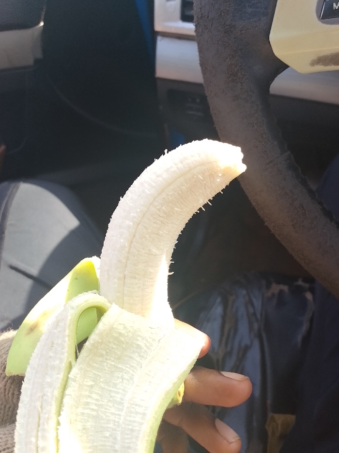 A partially peeled, light-colored banana, with its tip appearing broken or bitten, is held by a person's dark-skinned hand. Green and white sections of the peel are visible at the base of the banana. A light-colored fabric or glove covers part of the hand's thumb and palm area. The scene is situated inside a vehicle, evidenced by a dark, textured steering wheel on the right side of the frame and dark vehicle upholstery in the background on the left. Bright light illuminates the banana. The location is the City of Unknown, Unknown.