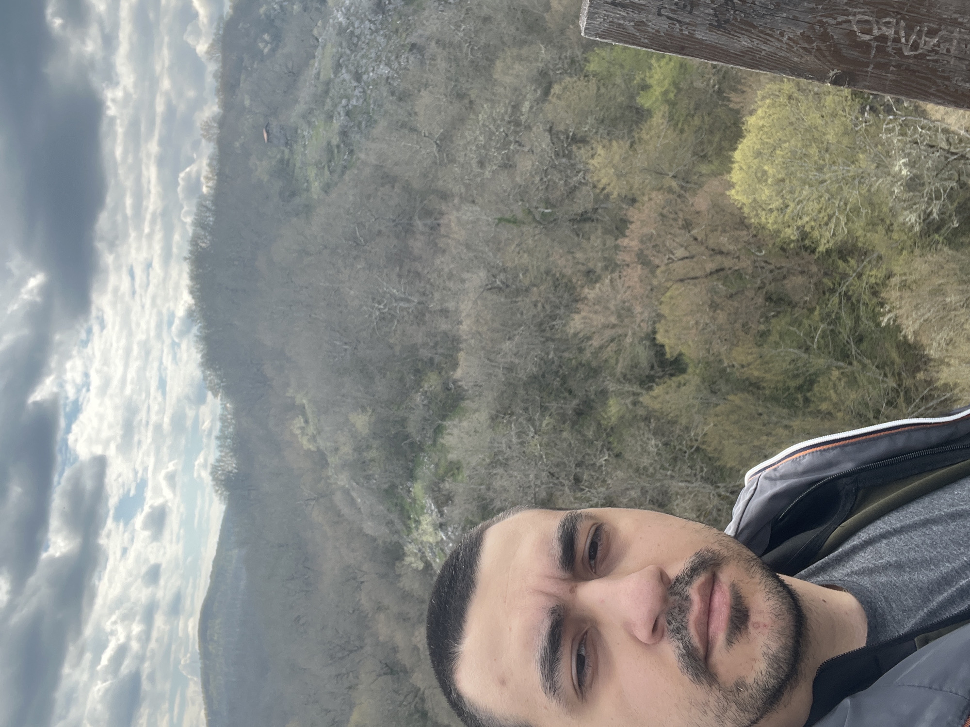 selfie of a man with a beard and dark hair. He is wearing a gray shirt and a jacket. Behind him is a view of a hilly, forested landscape. The sky is cloudy. A wooden railing is partially visible in the top right corner. The location is suggested to be Mladezhko, Bulgaria.