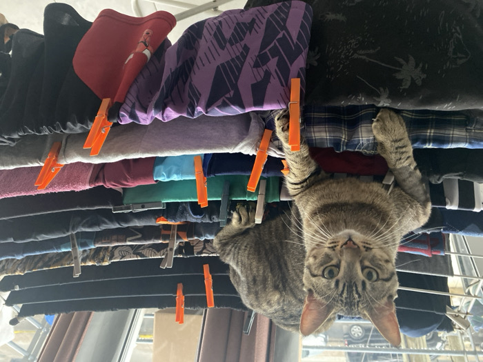 - "A tabby cat hangs upside down from a clothes drying rack" by FM-FOdGg1, licensed under CC BY 4.0