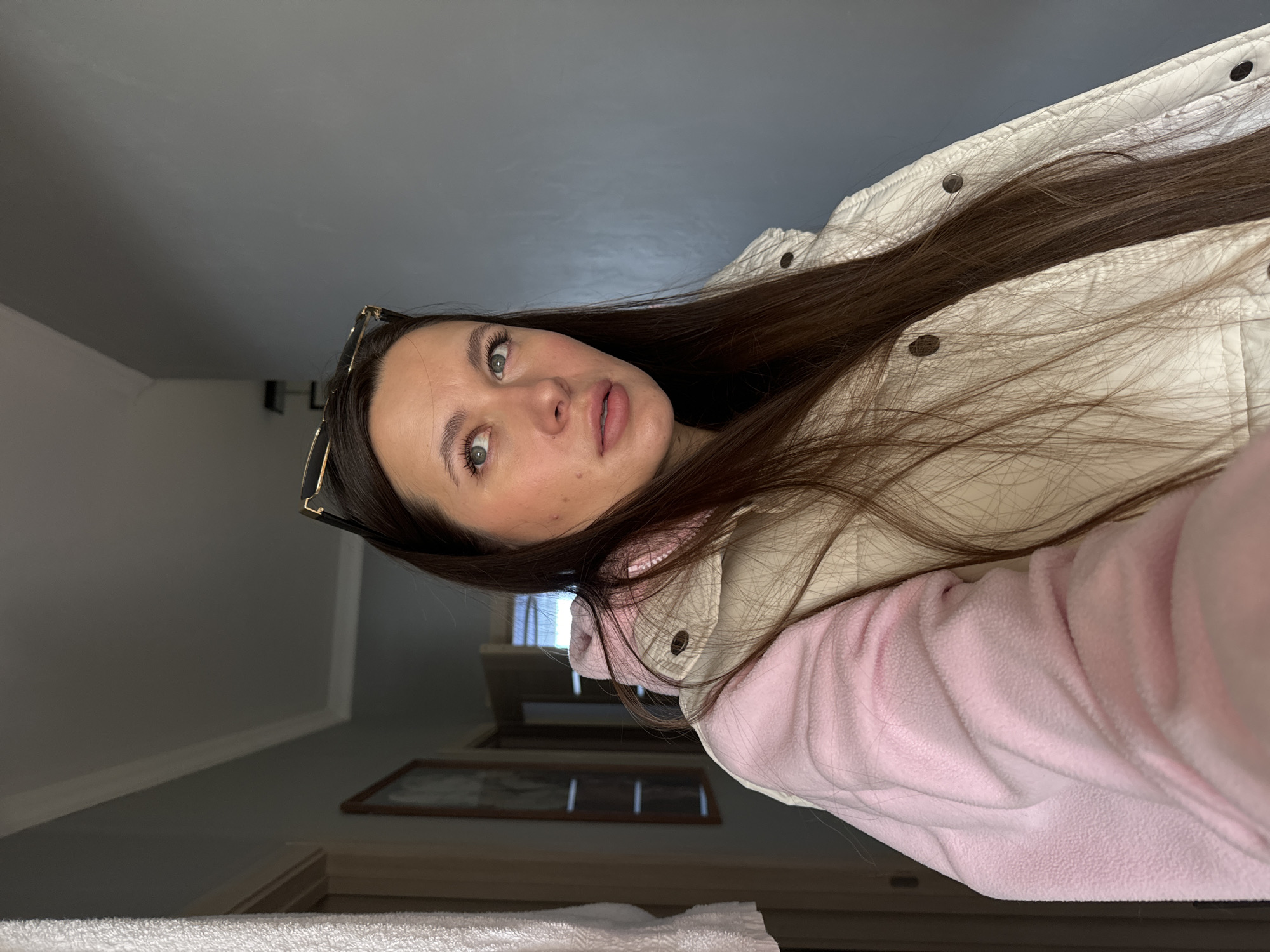 A close-up indoor image depicts a young adult female from the chest up, in what is identified as a residential setting in Vnukovo, Russia. The subject has long, straight, dark brown hair and light-colored eyes, with a neutral expression, looking upwards and to her left. She wears a light pink fleece long-sleeved garment underneath an off-white quilted vest, and dark-framed sunglasses are perched on top of her head. The background is a hallway or room, with walls painted in a lighter tone to the left and a medium blue-gray to the right. A white towel or similar textured item is partially visible on the far left. Further down the hallway, a light-colored doorframe leads to a partially open door, revealing bright light from an exterior source. A framed item hangs on the wall in the distant hallway. The ceiling is a darker gray, with a section of white crown molding visible on the left and a dark, square-shaped fixture overhead.