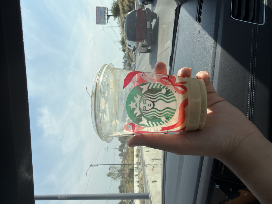 A hand holds an empty Starbucks cup adorned with a holiday design featuring a green logo and red ribbons. The cup appears to have contained a light-colored beverage, possibly a latte. Outside the car window, a highway with passing vehicles is visible, along with utility poles and a billboard in the distance under a bright sky. The interior of the car includes a dashboard with textured surfaces.