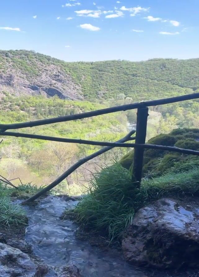 waterfall cascading from a mossy cliff face, viewed from an elevated vantage point. The camera initially focuses on a small stream trickling over rocks towards the edge, framed by a rustic wooden railing and green vegetation. It then pans up to reveal the full height of the waterfall against a bright blue sky with scattered clouds. The water falls in multiple streams, creating a misty spray as it descends. The backdrop includes a lush green valley.