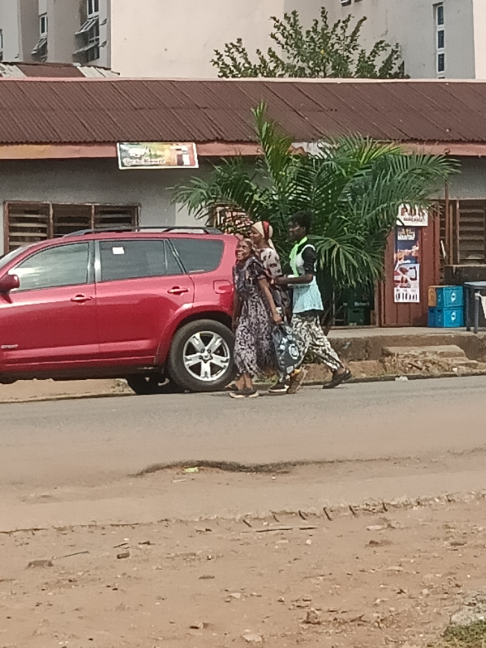 The image captures a daytime street scene in Owerri, Nigeria. Three adult females are walking in single file from left to right across a paved asphalt road. The lead woman on the left wears a dark, patterned dress and exhibits a smiling expression. The second woman wears a headscarf and a light-colored patterned dress. The third woman on the right wears a dark short-sleeved top, light patterned trousers, and a prominent light green vest, carrying a patterned tote bag in her left hand. To the left of the pedestrians, a red sport utility vehicle, identified as a Toyota RAV4, is parked parallel to the road. The immediate foreground features an unpaved, reddish-brown dirt shoulder. Behind the figures and vehicle, a single-story building with a reddish-brown corrugated metal roof is visible. A rectangular sign with colorful graphics hangs above the building's entrance. Lush green palm-like foliage is situated in front of this building. In the background, a taller, multi-story building with a light-colored facade and multiple windows rises above the single-story structure. On the right side of the road, beyond a concrete curb, another commercial storefront displays various posters, one distinctly labeled "FUJI AVAILABLE." Several blue plastic crates, some bearing "Heineken" branding, are stacked near this storefront. The road surface appears generally stable with some minor irregularities.