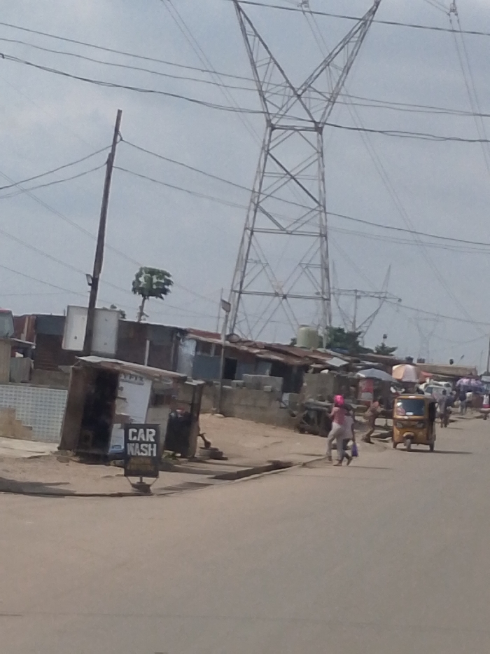 The image presents an urban street scene in Lagos, Nigeria, under a hazy, overcast sky. A prominent lattice-steel electricity transmission tower stands in the mid-ground, slightly right of center, supporting multiple high-tension power lines that traverse the upper frame. Another similar tower is visible further in the background to the right. The foreground and mid-ground are occupied by a paved asphalt road, which appears slightly inclined. Along the left side of the road, an unpaved shoulder borders a series of informally constructed structures. These buildings, likely commercial or residential, are characterized by corrugated metal roofs and walls assembled from varied materials, including concrete blocks and salvaged panels. A small, open-fronted structure in the immediate left foreground displays a sign reading "CAR KASH." Adjacent to these structures on the left, a tall wooden utility pole supports additional wires. A small tree with green foliage is visible above the structures in the mid-ground. Several individuals are present on the unpaved shoulder. In the mid-ground, two people are walking; one wears a pink helmet and light-colored clothing. Further down the road on the right, a yellow auto-rickshaw (Keke Napep) is visible on the paved surface, and additional indistinct pedestrian figures suggest ongoing activity.