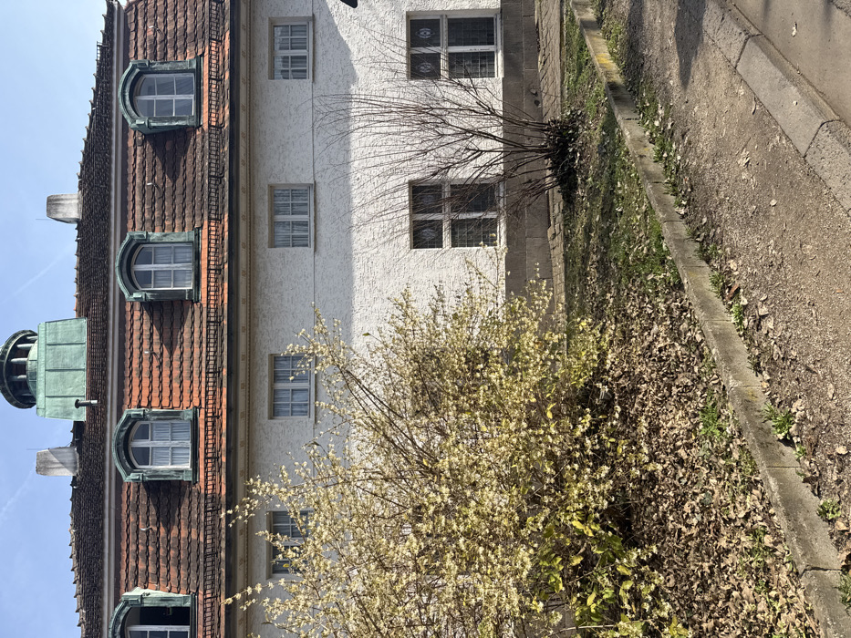 This image depicts the exterior of a multi-story building in Bad Nauheim, Germany, under clear sky conditions. The building features a steeply pitched roof covered in reddish-brown terracotta tiles, exhibiting some dark streaking. Centrally positioned on the roofline is a copper-clad dome with vertical segments and a finial, showing greenish patination. Four arched dormer windows with multi-pane white frames and visible light-colored curtains are integrated into the roof, their surrounds also appearing to be patinated copper. Two light-colored chimneys are present on the roof. The building's facade is white, textured stucco. Below the roofline, three evenly spaced rectangular windows with white frames and light-colored curtains are visible. Below these, two larger rectangular windows with multi-pane white frames and curtains are present, featuring a darker border. In the immediate foreground, to the left, is a dense, deciduous shrub in full bloom, covered with numerous small, pale yellow flowers, and some green leaves at its base. To the right of this, a smaller, bare deciduous shrub with thin, dark brown branches stands without leaves or flowers. The ground around the shrubs is covered with a mixture of dry, fallen brown leaves, sparse green grass, and bare soil. A concrete curb runs diagonally across the lower right quadrant, separating the vegetated area from a dirt or gravel path. A second, parallel concrete curb is partially visible further to the right. Shadows suggest direct sunlight originating from the left. No individuals or discernible actions are present in the scene.