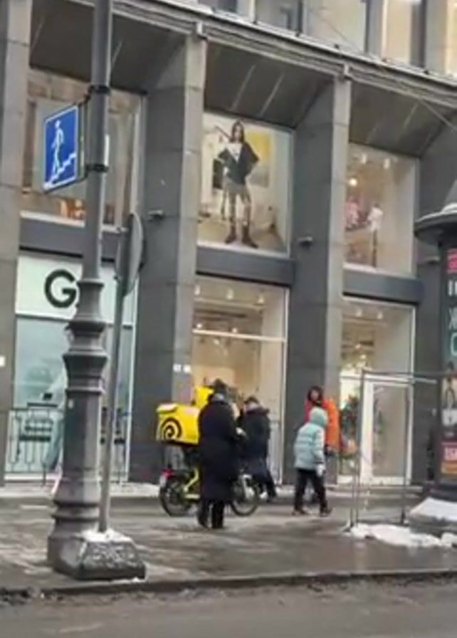 street scene with several pedestrians walking on a sidewalk in front of a store. The store has large windows displaying fashion items. A delivery person in a bright yellow uniform and a bicycle with a large insulated container on the back is also present. A pedestrian is interacting with the delivery person. The street appears to be wet with some snow on the edges. The weather appears to be cold.