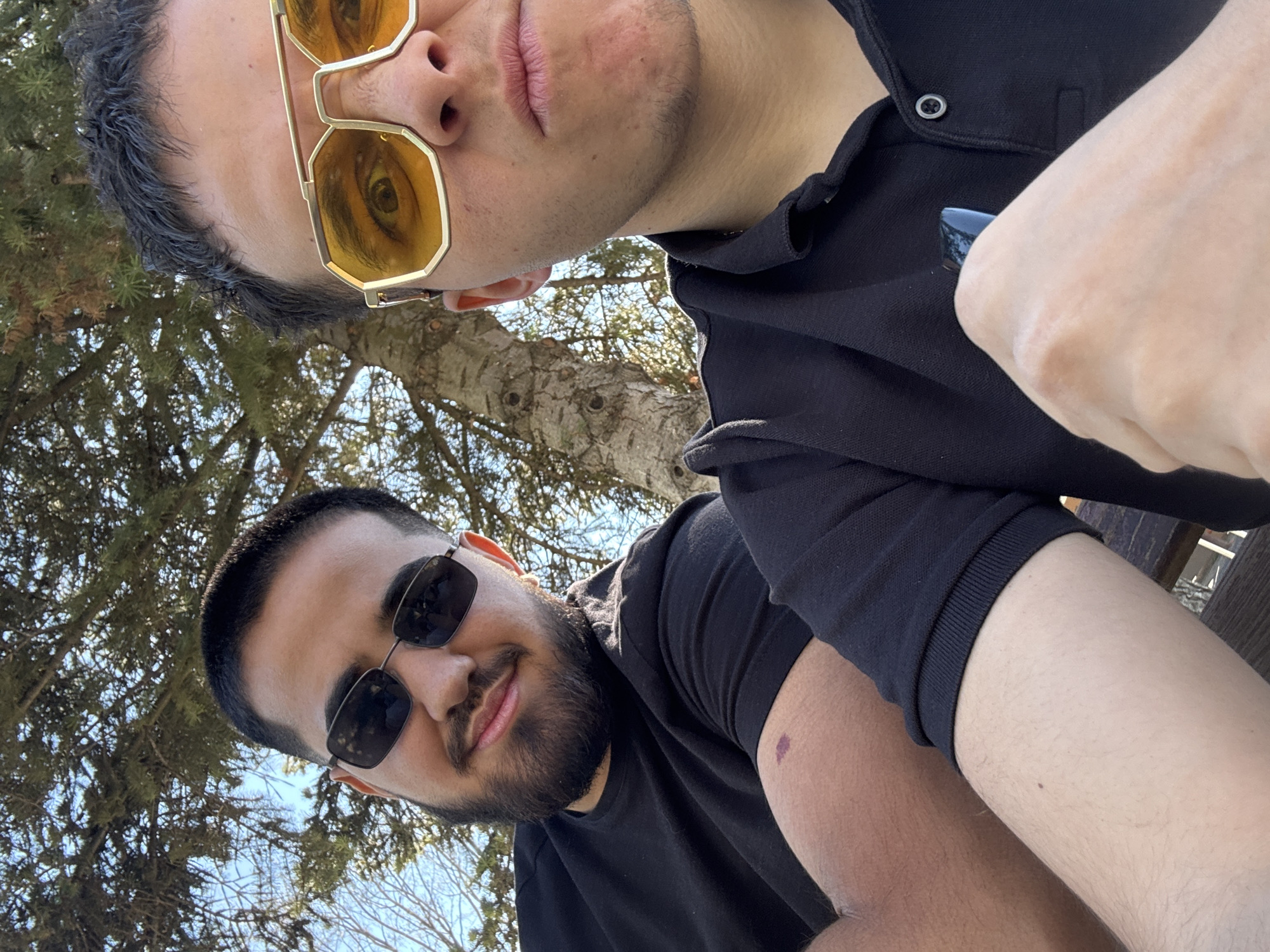 The image depicts two men in an outdoor setting. The man at the bottom of the frame is wearing black sunglasses and a black t-shirt, with a beard and mustache visible. There is a small, dark mark on his upper arm. The man at the top of the frame is wearing gold-rimmed, yellow-tinted sunglasses and a black collared shirt. The background consists of a tree and branches, with glimpses of a blue sky visible through the foliage. The photo appears to have been taken looking up towards the sky. There is no information to confirm the location is in Kostinbrod, Bulgaria.