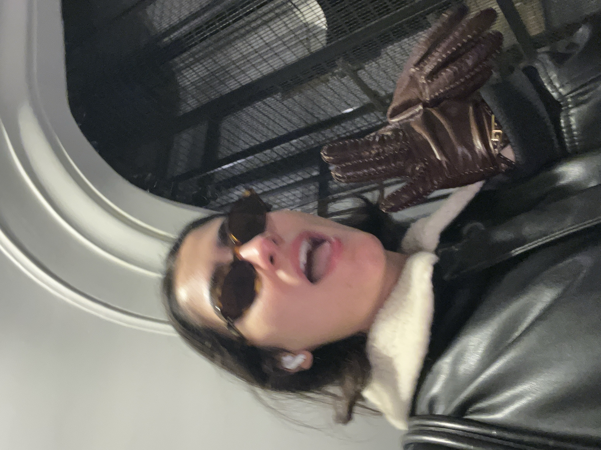 A young female subject is captured in a low-angle, indoor selfie, likely within a grand building or department store in Paris, France. She wears dark, oval-frame sunglasses and a black jacket with a prominent cream-colored shearling collar. A white earbud is visible in her left ear, and her mouth is open, suggesting speech or an exclamatory expression. Her raised right hand displays a dark brown leather glove with distinct stitching details on the fingers. A gold-toned metallic clasp is visible on her right wrist, beneath the glove. The background features a large, curved white architectural molding on the upper left, transitioning to a dark, intricate metal grid structure on the upper right, consistent with a historic elevator shaft or ornate staircase enclosure.