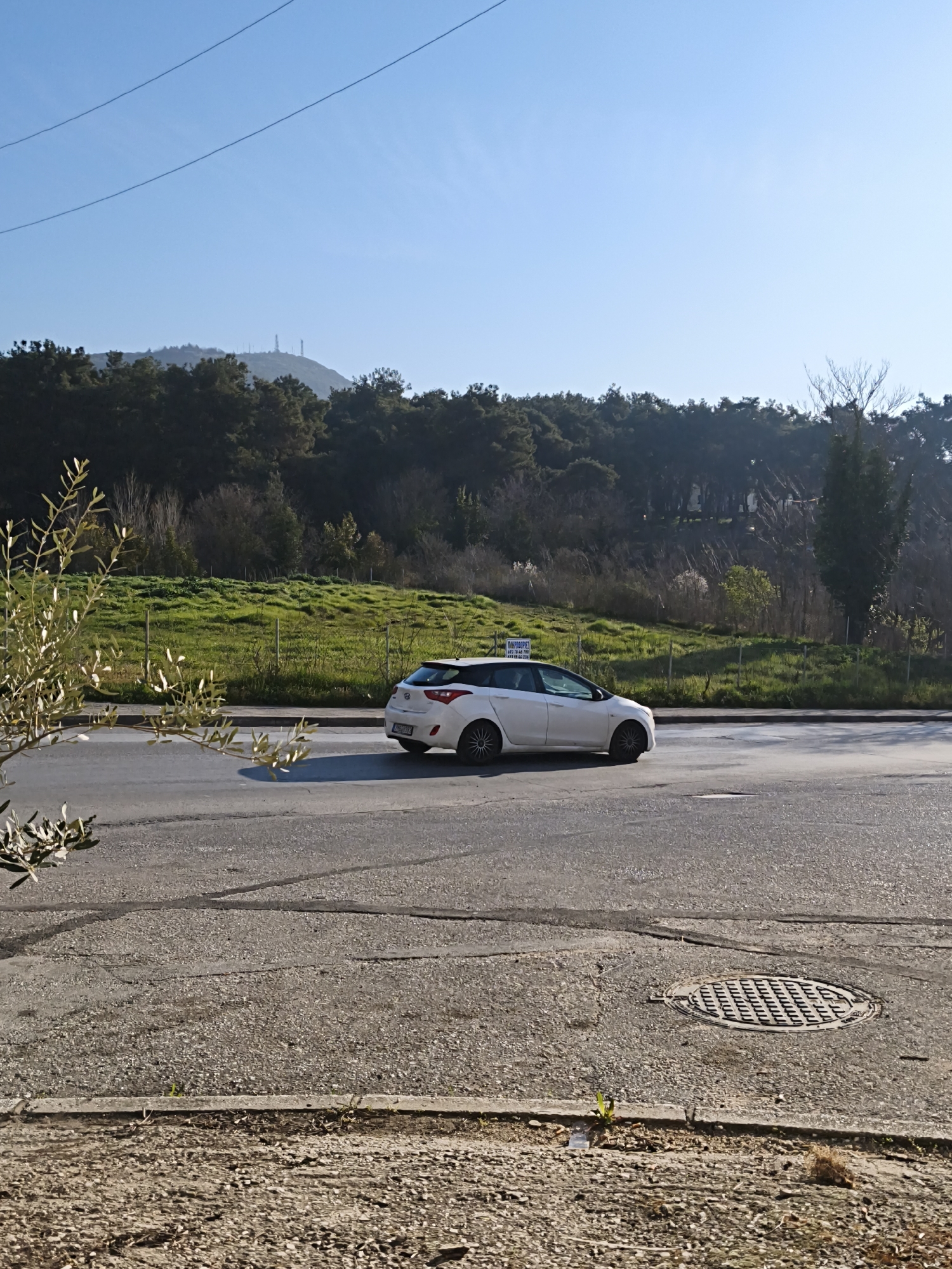 A white Hyundai i30 hatchback is stationary on an asphalt road in Drama, Greece, under a clear blue sky. The vehicle is positioned on the right side of the road, facing left, and features a "FOR SALE" sign on its passenger-side rear window, displaying the Greek text "ΠΩΛΕΙΤΑΙ" along with phone numbers "0932 78 44 76" and "6978 444 877". The road surface exhibits cracks and incorporates a circular metal manhole cover on the right. An olive tree branch with sunlit leaves partially frames the foreground on the left. In the midground, a green, fenced, grassy incline leads up to a dense forest. The background is dominated by a forested mountain, specifically Korylovos hill, which is topped with multiple communication towers and antennas. No individuals are present in the scene.