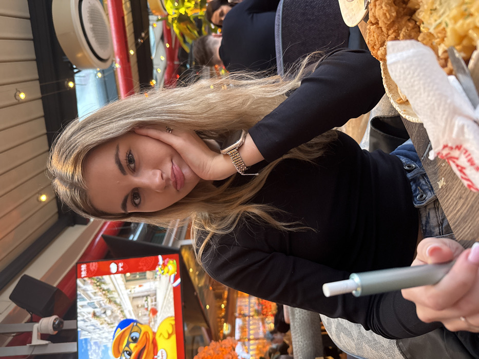 - "A young adult female, with long blonde hair, wearing a black long-sleeved top and blue jeans, is seated at a wooden table in an indoor restaurant identified as a Happy Bar & Grill location in Sofia, Bulgaria" by FM-ZIWMH3, licensed under CC BY 4.0