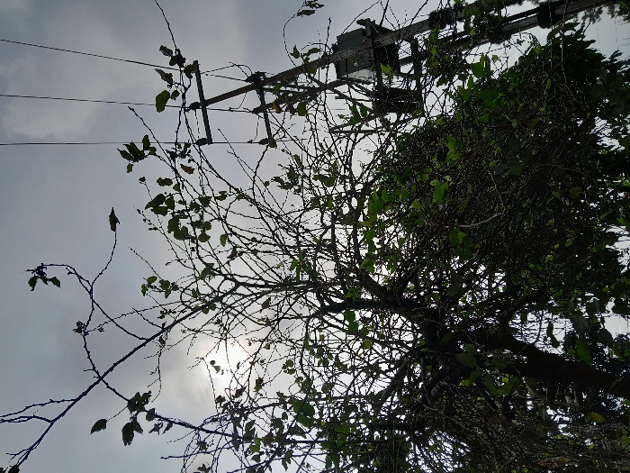 This image captures an outdoor scene in Ciherang, Indonesia, viewed from a low-angle perspective looking upwards. A large, deciduous tree, partially defoliated with numerous bare branches and scattered clusters of green leaves, dominates the left and central portions of the frame, silhouetted against the sky. To the right of the tree, a utility pole, dark in color and appearing to be concrete or metal, stands vertically. This pole supports several dark electrical wires stretching horizontally across the upper right quadrant and features a dark, rectangular transformer box attached near its apex. The sky is overcast with a uniform grey tone, showing a brighter, diffused light source in the upper left-center behind the tree's branches. No individuals or animals are present, and no specific actions or interactions are depicted.