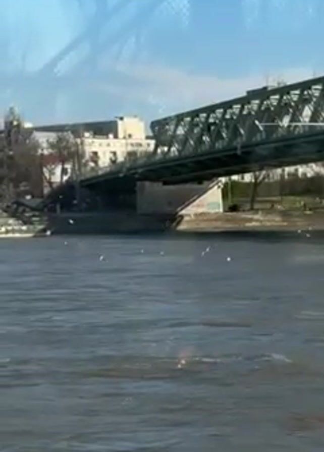 river with a bridge in the background. There are some buildings and trees visible on the riverbank. There are also some birds flying over the river. There is a red object floating in the river. The video is taken from a boat or a moving vehicle. The sky is blue and the weather appears sunny.