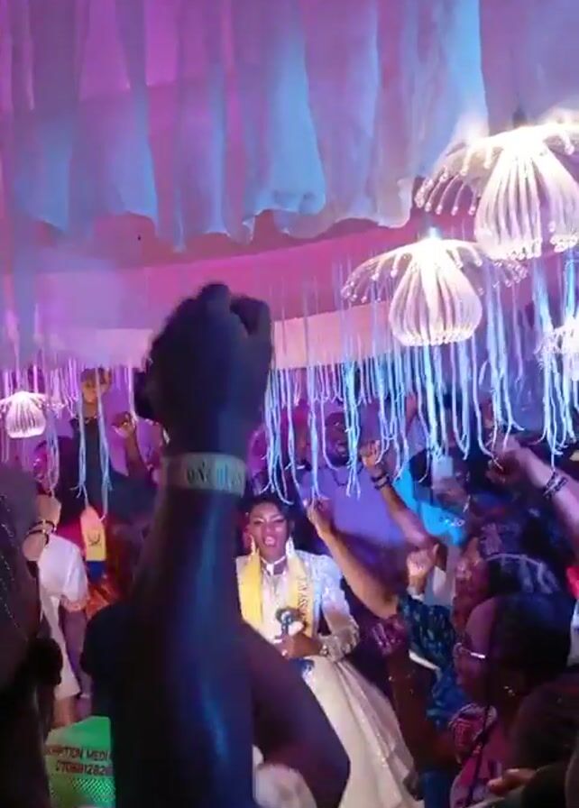 group of people celebrating under a decorated canopy. The canopy is adorned with white fabric and hanging jellyfish-like decorations illuminated with blue light. The central figures, a bride and groom, are wearing sashes. The people around them are dancing, raising their hands, and cheering. A person in a green shirt with "Assumption Media Images" visible on the back is filming the event. The lighting changes color, cycling through hues of blue, green, and pink.