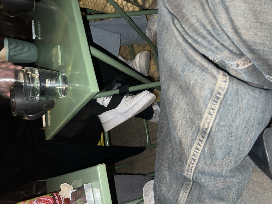 The image depicts a low-angle view of four individuals seated around two small, light green metal tables, consistent with an outdoor cafe or bar setting in Athens, Greece. On the primary table, from left to right, are a dark grey ceramic mug, a clear glass filled with water, a small light green square coaster, a ridged light green cup, and a partially obscured smartphone. Below this table, the legs of two individuals are visible: one wearing black pants and white Nike Air Force 1 sneakers, and another wearing light blue denim jeans and white/grey sneakers. On the secondary table to the left, partially visible, are a pack of Parliament cigarettes with Greek text, a crumpled paper napkin, and a red-patterned packaging labeled "pomegranate Green T". Below this table, the leg of a third individual is visible, wearing grey trousers and white sneakers. The foreground is dominated by the legs of a fourth individual, clad in light blue denim jeans. The lighting suggests an evening or indoor setting. The ground surface is light-colored and textured. No specific actions beyond seated presence and the placement of beverages and personal items are discernible.