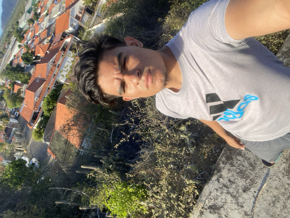 A young adult male, with dark hair and a neutral expression, is captured in a high-angle selfie from an elevated position overlooking the city of Altagracia, Venezuela