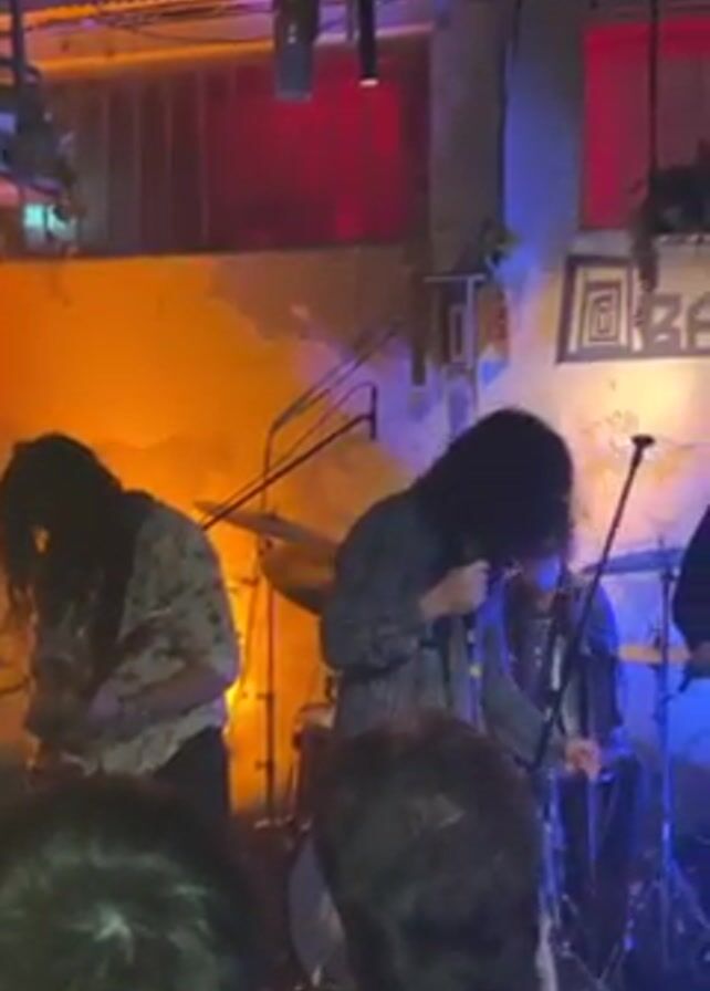 A shaky, low-angle video captures a band performing on a small stage in a dimly lit venue