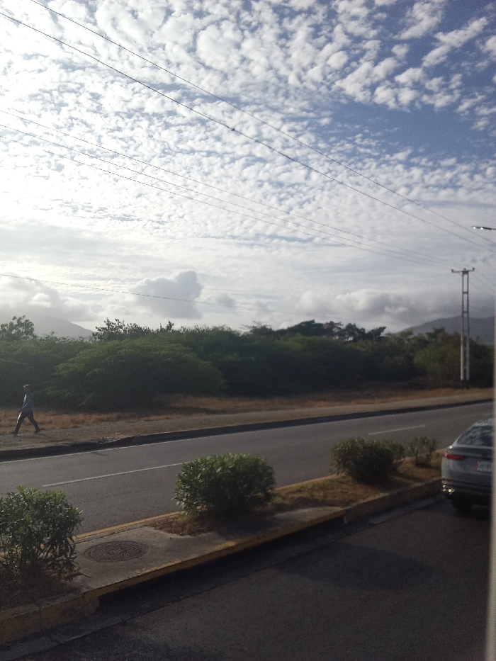 The image captures an outdoor daytime scene in Pampatar, Venezuela, featuring a road, dense vegetation, and a cloudy sky. The upper portion of the frame is dominated by a sky filled with numerous small, scattered white clouds, with multiple parallel overhead power lines horizontally traversing the view. A bright light source, presumably the sun, is positioned in the upper left, creating a slight atmospheric glow. In the mid-ground, a multi-lane asphalt road extends horizontally. A concrete median strip with several small, rounded green bushes and patches of dry grass separates the lanes. A dirt and gravel shoulder runs along the left side of the road, where a single male individual is observed walking from left to right. He is dressed in a light-colored long-sleeved shirt and dark pants, captured mid-stride. Beyond the road and shoulder, a thick, continuous line of dark green, scrubby trees and vegetation forms a natural barrier. In the far background, distant hills or mountains are partially visible beneath a layer of clouds. On the right side of the frame, a tall, dark grey metal utility pole, equipped with crossbars and insulators, stands erect, rising above the treeline. In the immediate foreground on the right, the rear quarter of a grey or silver passenger vehicle is partially visible, parked facing away from the camera. In the immediate foreground on the left, a circular metal manhole cover is embedded within the concrete median.